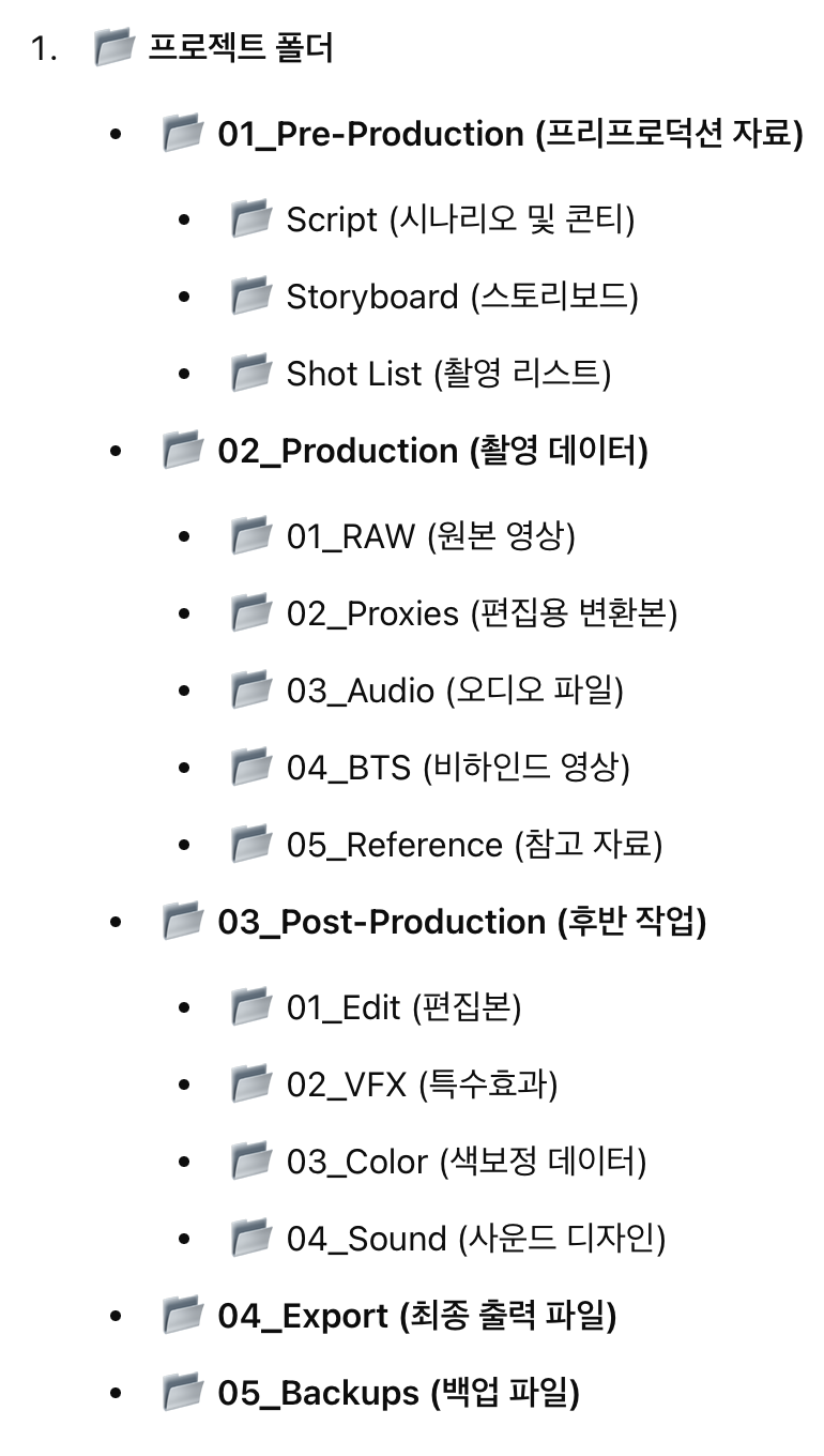 이러한 폴더 구조를 유지하면 프로젝트가 진행되는 동안 팀원들이 같은 기준을 따를 수 있으며, 후반 작업에서도 필요한 데이터를 빠르게 찾을 수 있습니다. 또한, 파일명을 일정한 규칙으로 설정하면 검색이 더욱 용이해집니다.